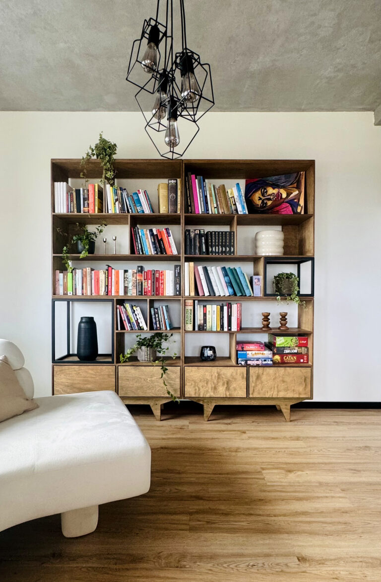 Dzięki zestawowi specjalnie na tę okazję zaprojektowanych modułów otwartych przeróżnej maści i wymiaru, mebel posłuży, by pomieścić ukochany zbiór książek i albumów, bibeloty fajansowe i nie tylko, pamiątki rodzinne, a w rzędzie dolnych, pojemnych szuflad możesz pochować drogocenne skarby. Do tego dwa ażurowe kubiki metalowe, które dodają tak dużemu regałowi lekkości.