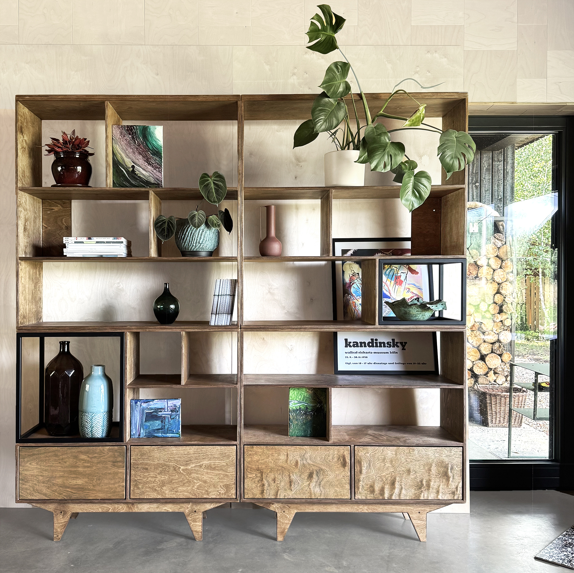 Dzięki zestawowi specjalnie na tę okazję zaprojektowanych modułów otwartych przeróżnej maści i wymiaru, mebel posłuży, by pomieścić ukochany zbiór książek i albumów, bibeloty fajansowe i nie tylko, pamiątki rodzinne, a w rzędzie dolnych, pojemnych szuflad możesz pochować drogocenne skarby. Do tego dwa ażurowe kubiki metalowe, które dodają tak dużemu regałowi lekkości.