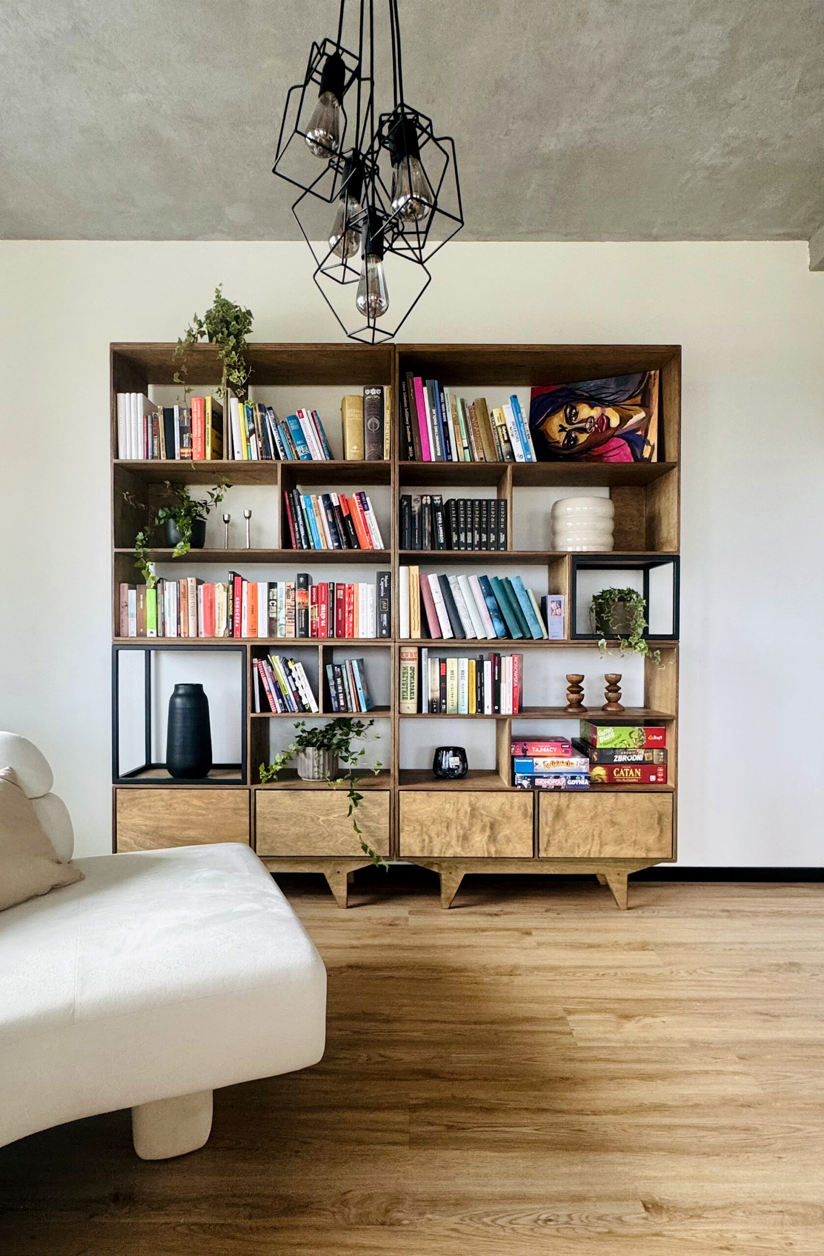 RAJ.lit to centrum dowodzenia i obowiązkowy element wystroju pełnoprawnego salonu. To minimalistyczny regał modułowy, który łączy w sobie dwa materiały - drewno i stal.